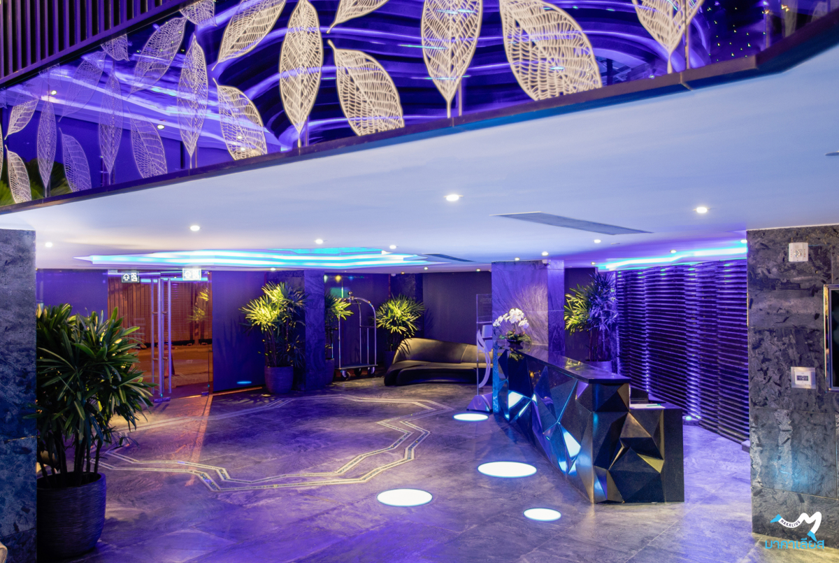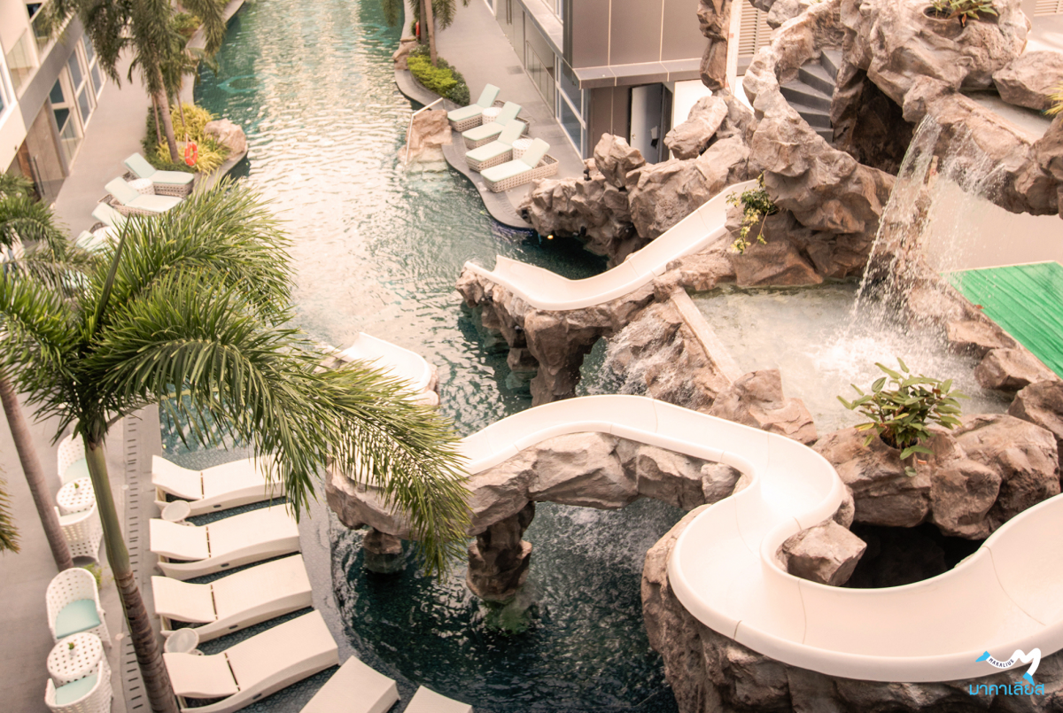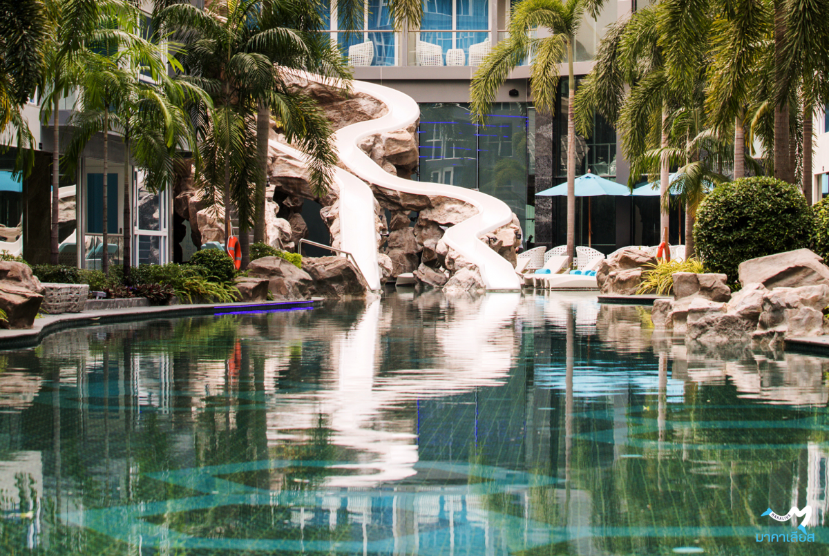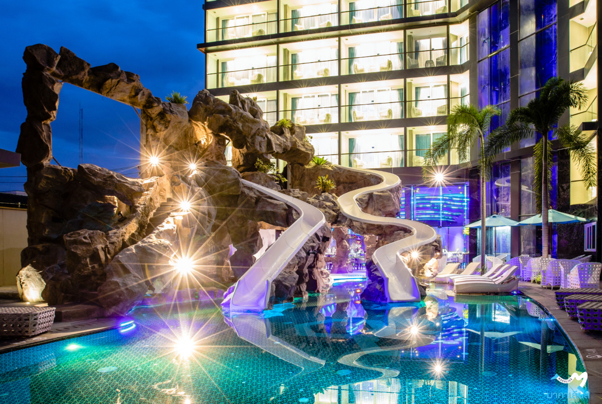 Azure Hotel ที่พักสุดชิคย่านพัทยา เหมือนหลุดไปอยู่โลกอนาคต ด้วยการตกแต่งสุดเก๋ มีอควาเรียมขนาดย่อมกลางโรงแรม แถมความปังยังมีสระน้ำพร้อมสไลเดอร์สุดมันส์ให้เล่นมันส์ๆด้วยน้า