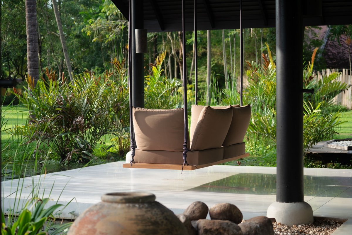 ห้อง Garden Room มาพร้อมกับเตียงขนาดใหญ่ นุ่มสบาย มีระเบียงให้นั่งชิล บรรยากาศธรรมชาติ