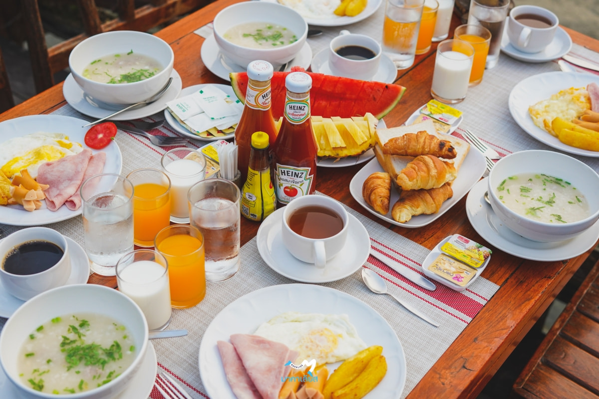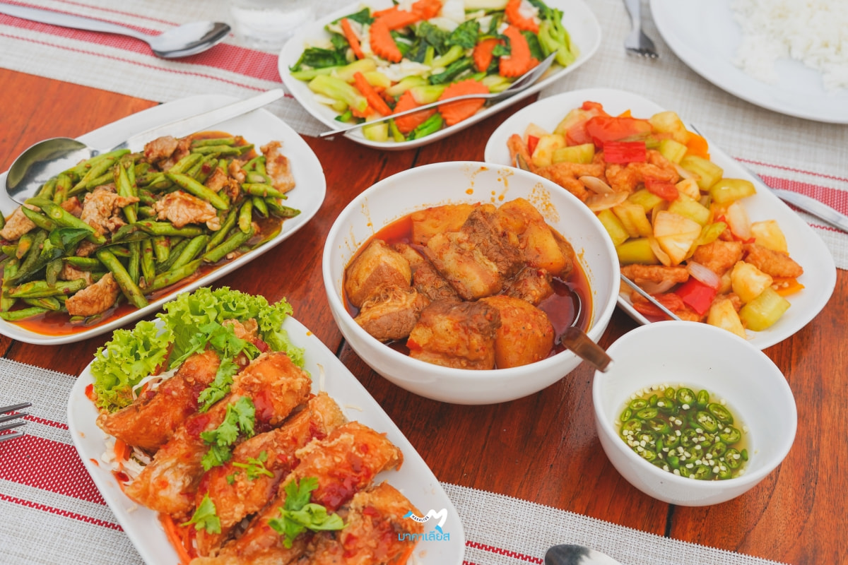 อาหารตอนเย็นเป็นเซตเมนูอาหารไทย น่ากินมากๆเลย อาหารเช้าคืออิ่มอร่อยเมนูเยอะ ไข่ เบค่อน ข้าวผัดมาหมด