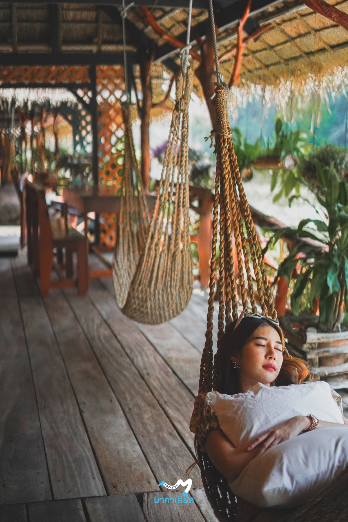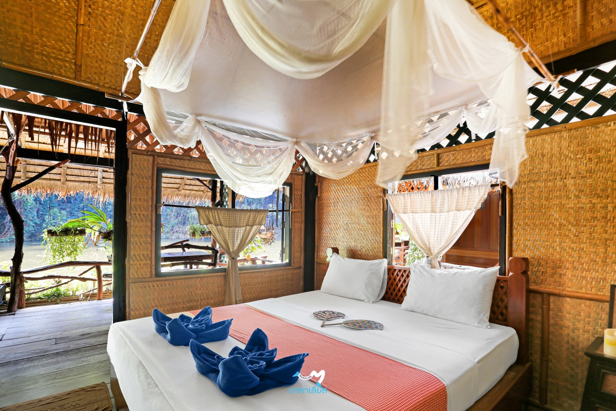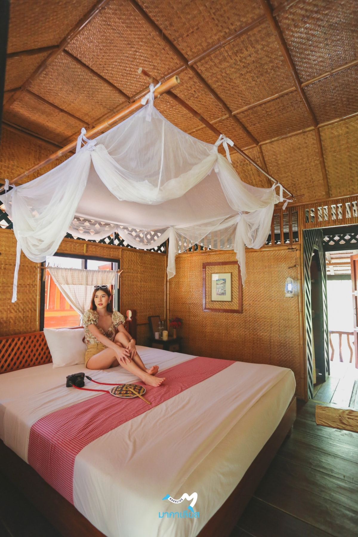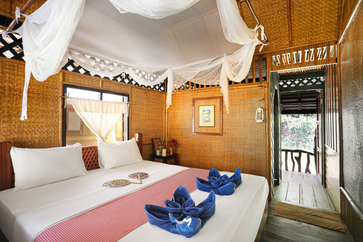 ห้องพักสะอาด มีมุ้งไม่ต้องกลัวยุง มีห้องน้ำในตัว และมีระเบียงทั้งหน้าห้องและหลังห้อง ที่สำคัญมีเปลให้นอนชิลๆได้ทั้งวัน โดย Concept ของที่นี่คือเขาจะไม่ใช้ไฟฟ้าและสัญญาณโทรศัพท์ จึงจะมีไฟฉายเล็กๆที่มีติดไว้กับกุญแจห้อง โดยทุกห้องพักจะมีเปลด้านหน้า และด้านหลังริมน้ำแบบนี้ หาหนังสือสักเล่มมาอ่านเพลินจริง และส่วนต่างๆของทางรีสอร์ทจะสว่างไสวด้วยตะเกียงทั้งรีสอร์ท ตอนดึกๆสวยมาก