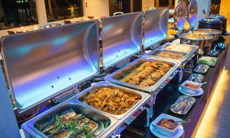 เมนูอาหารอินเตอร์หลากหลาย ซีฟู้ด และของหวานมีให้เลือกทานเยอะมาก ตักได้ไม่อั้น ไม่มีขาด ของที่นี่สดเวอร์ หากสนใจอยากล่องเรือ ทานอาหารบุฟเฟต์แบบจัดเต็ม ราคาไม่แรง พร้อมบรรยากาศดีๆ ยามค่ำคืนของเมืองกรุง