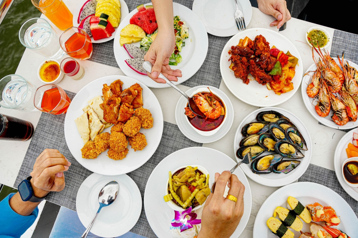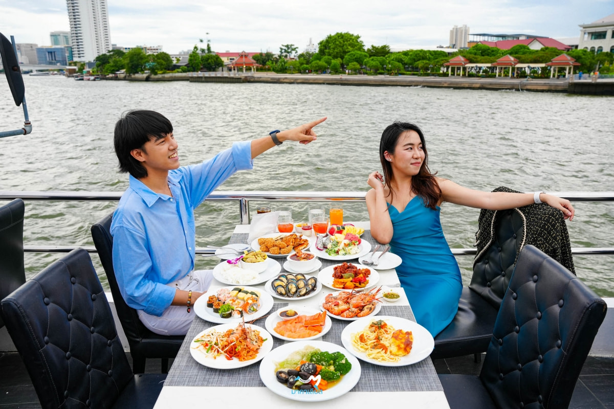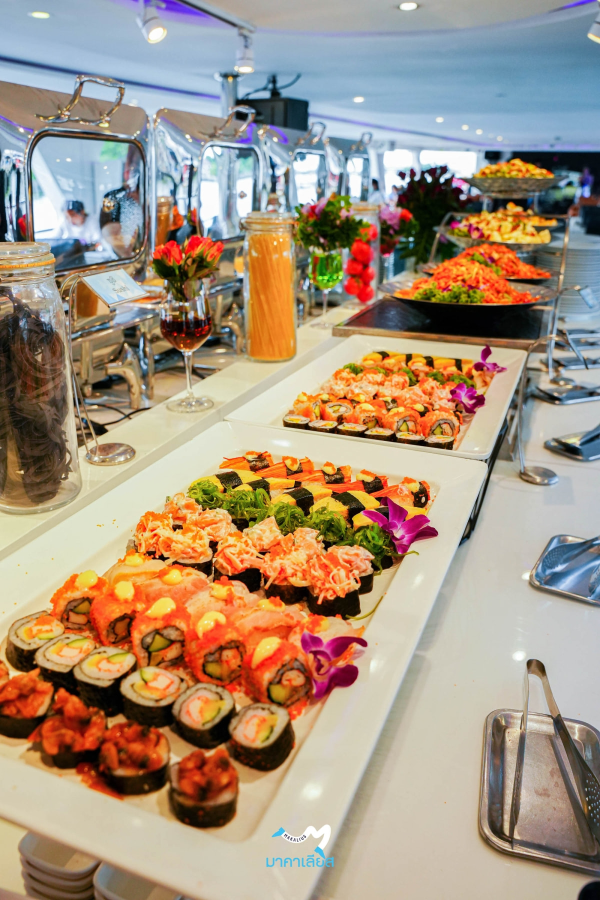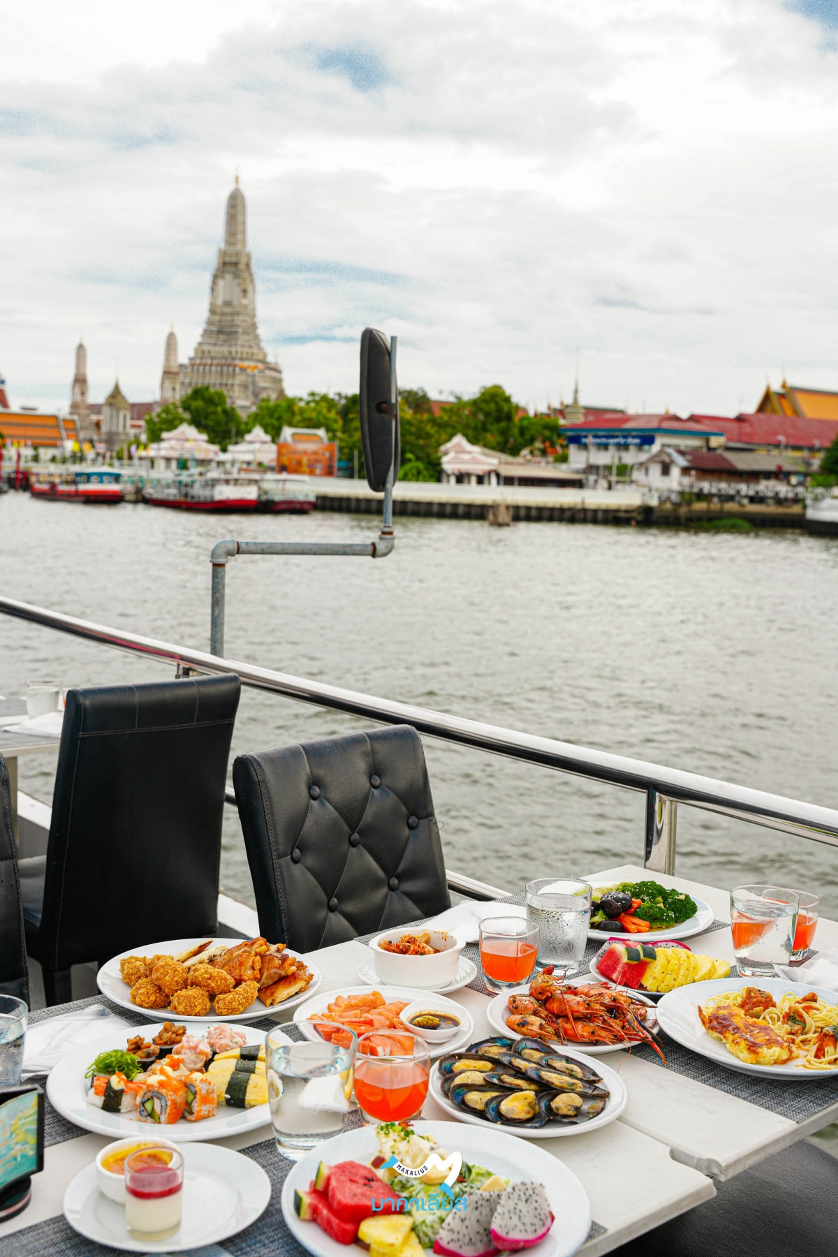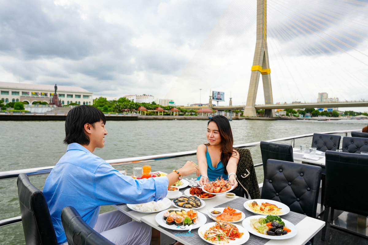 จัดเต็มความอลังการล่องเรือชมวิวแม่น้ำเจ้าพระยา พร้อมรับประทานมื้ออาหารสุดพิเศษ ขนมาครบทั้งบุฟเฟ่ต์ซีฟู้ด กุ้งแม่น้ำเนื้อแน่นๆ แซลม่อน จิ้มน้ำจิ้มซีฟู้ด และ แซลม่อนซาซิมิ ซูชิ และอาหารนานาชาติสุดอร่อยอีกเพียบ รสชาติถึงเครื่องทั้งไทยและเทศ เมนูคาวหวานคือมาคร บที่สำคัญเลยเติมได้ไม่อั้น! ทั้งหมดนี้ในราคาคนละหลักร้อย สำหรับลูกค้ามาคาเลียสเท่านั้นจ้า