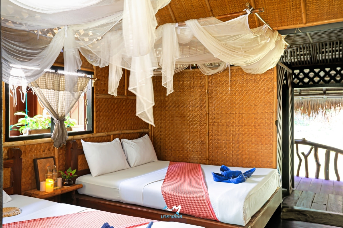 ห้องพักสะอาด มีมุ้งไม่ต้องกลัวยุง มีห้องน้ำในตัว และมีระเบียงทั้งหน้าห้องและหลังห้อง ที่สำคัญมีเปลให้นอนชิลๆได้ทั้งวัน โดย Concept ของที่นี่คือเขาจะไม่ใช้ไฟฟ้าและสัญญาณโทรศัพท์ จึงจะมีไฟฉายเล็กๆที่มีติดไว้กับกุญแจห้อง โดยทุกห้องพักจะมีเปลด้านหน้า และด้านหลังริมน้ำแบบนี้ หาหนังสือสักเล่มมาอ่านเพลินจริง และส่วนต่างๆของทางรีสอร์ทจะสว่างไสวด้วยตะเกียงทั้งรีสอร์ท ตอนดึกๆสวยมาก